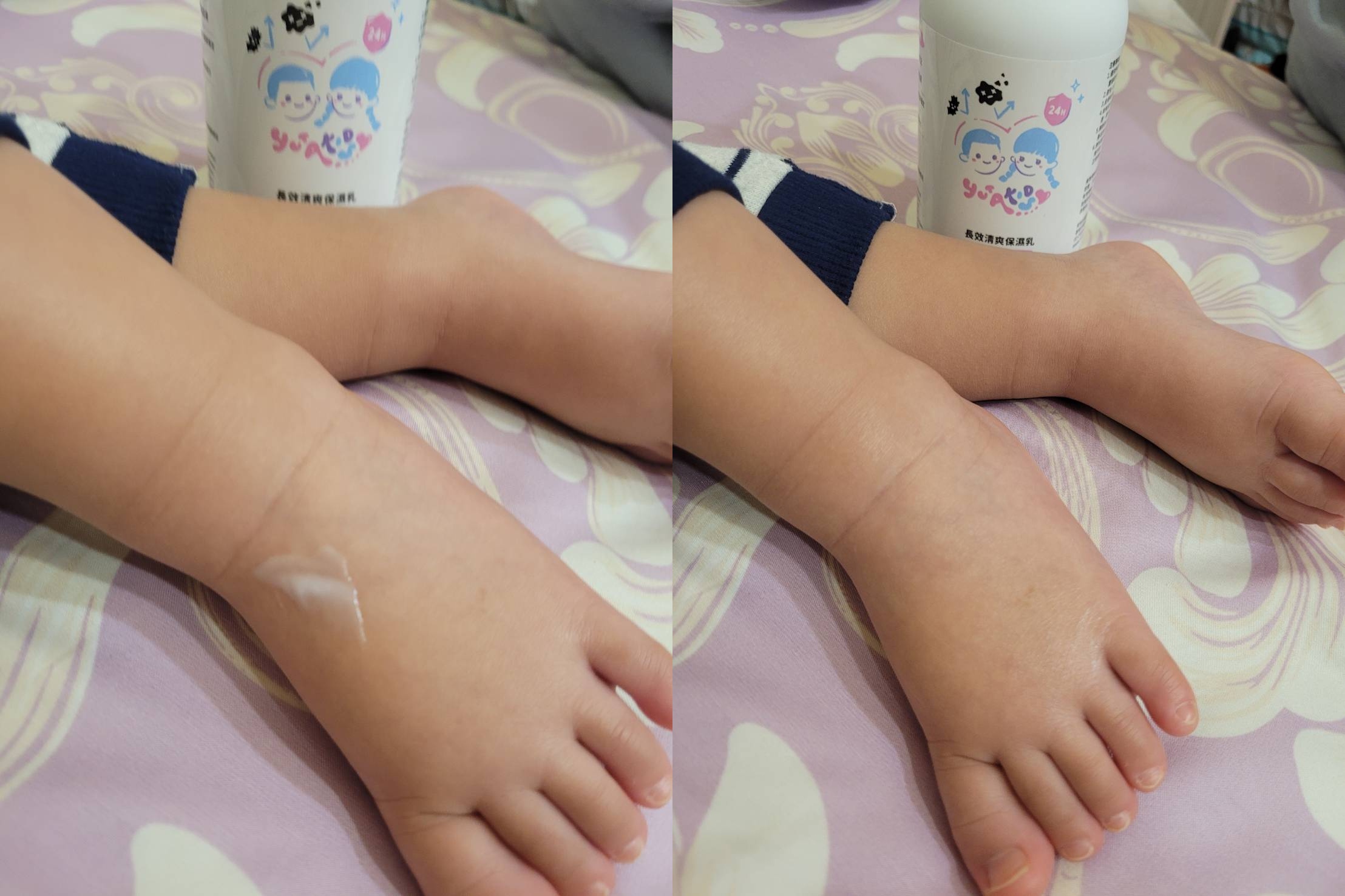 家中寶寶的腳背特別容易乾燥,實際擦上後可以明顯感受到肌膚在吸收,乳液延展性很好,一推就開,非常水潤;吸收後摸起來滑滑的,但完全不黏膩,日常大量使用也不會有負擔感。