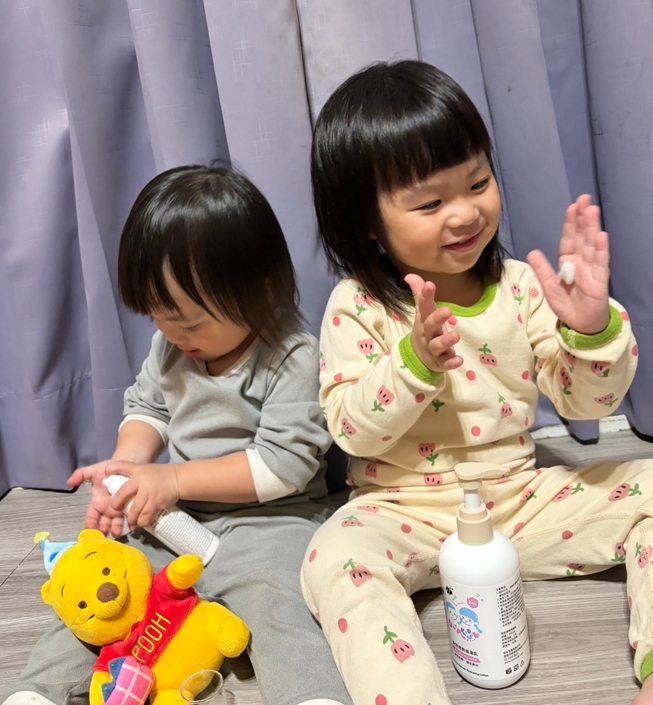 使用兩週下來,最大的感受是質地清爽好吸收,保濕效果也不錯,即使是修護乳也不會太油膩。對異膚寶寶來說,肌膚太乾需要補油保濕,但太油膩又會讓冬天穿長袖不舒服,或者被衣服蹭掉,乳液根本來不及吸收。Yutakids 完全解決了這個困擾,大寶現在洗完澡會自己拿著乳液擦全身,看得出來非常喜歡!妹妹也默默拿著保濕乳塗抹小臉蛋,畫面真的好可愛🥰。