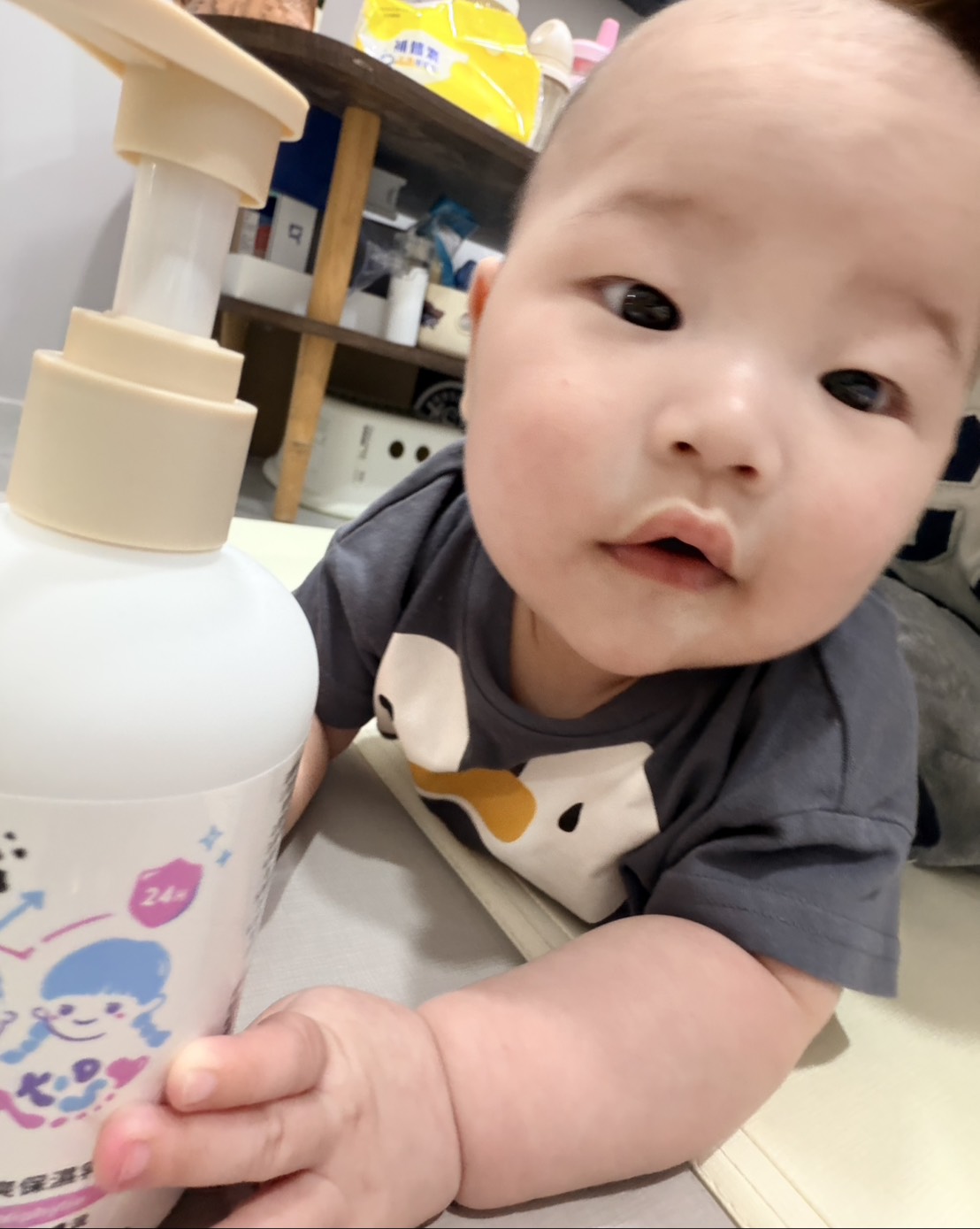 一開始注意到這瓶小瓶的乳液是因為它 "灰色的質地",不是壞掉唷~這個灰色質地來自它們的 "獨家成分 Miphytia",跟一般乳液不太一樣,很特別~實際使用起來很好推開、吸收快,也完全不黏膩,寶寶使用時也很願意配合👍