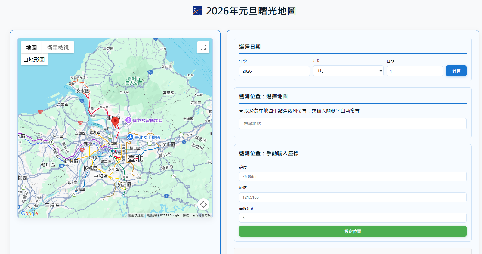 「迎曙光、賞日出」是許多人跨年的熱門活動之一,為了讓民眾掌握元旦各地曙光與日出的精確時刻,臺北天文館特別推出「2026年元旦曙光地圖」,彈指精算各地新年曙光時刻,只需在互動地圖上點擊觀賞地點,即可快速獲得該地元旦當日的曙光與日出時間,精準迎接新年的第一道光芒。