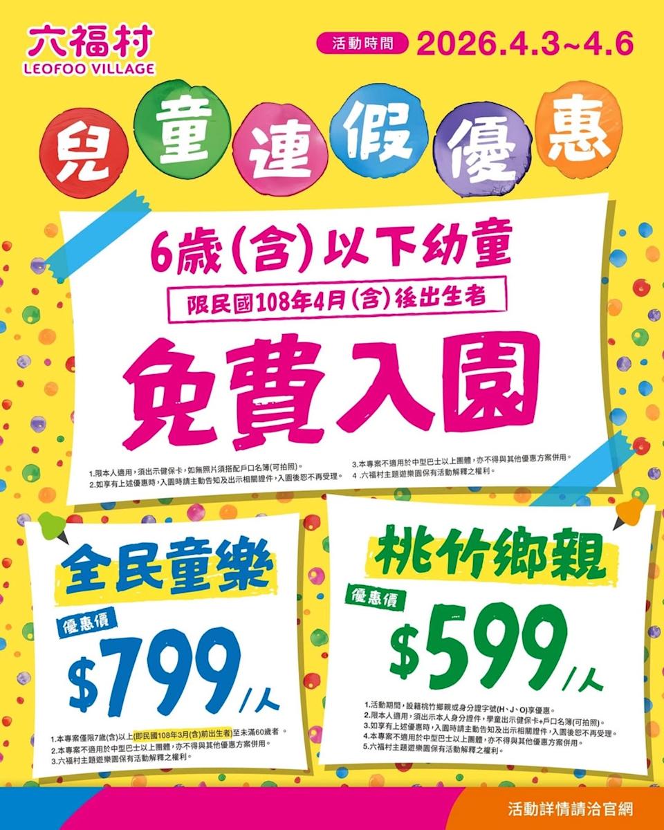 全國國小(含)以下兒童,出示「2026兒童月探索摺頁」或持相關證明文件(如學生證、健保卡)即可享兒童+一名家長免費入園的優惠,此外,4/3(五)~4/5(日)樂園也延長營業時間到晚上9點,4/6日(一)則營業到下午6點,讓家庭可以更加靈活地安排遊玩時間。