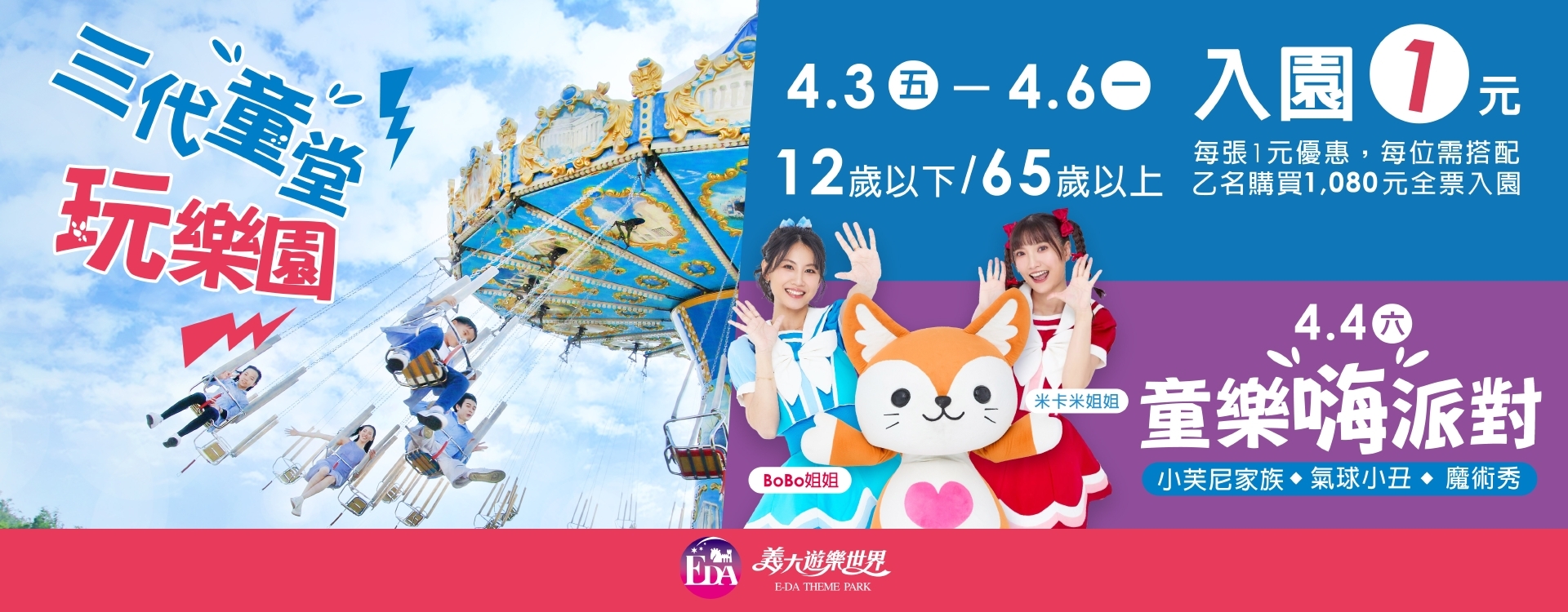 義大遊樂世界針對12歲以下兒童、65歲以上長者推出了「入園1元」的優惠票價(需搭配成人全票1080元購票)。