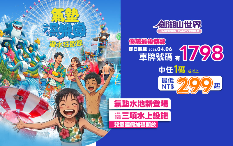 劍湖山世界推出的優惠活動非常有趣,遊客可根據汽車或機車車牌號碼中的特定數字,汽車、機車車牌號碼上有「1」、「7」、「9」、「8」任一碼,享車上每人499元購票優惠,任2碼(含)以上則享車上每人299元優惠,同一號碼不重複列入計算(例如車牌號碼1123對中1碼、1777對中2碼);每輛機車至多優惠2人,汽車至多優惠4人。