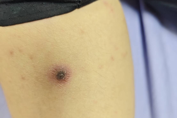 然而,王怡人主任在理學檢查過程中,敏銳的發現男童右腿有一處「黑色焦痂」,外觀像被煙蒂燙傷,而病人卻感覺「毫無痛癢」,進一步詢問得知,男童近期曾至苗栗山區露營,同團也有人出現紅疹。