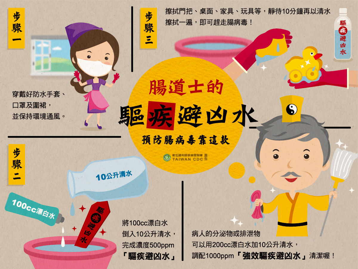 漂白水是居家消毒的一大利器,疾管署今日特別邀請「豆豆媽咪健康生活家」吳霈蓁小姐,一同示範腸病毒消毒方式及步驟。豆豆媽咪指出,調配消毒水時應穿戴防水手套、口罩及圍裙,並注意環境通風;一般環境消毒使用的消毒水濃度為500 ppm,即8瓶1,250 c.c.保特瓶清水加入100 c.c.漂白水;用於處理腸病毒患者分泌物或排泄物汙染的消毒水濃度則為1,000 ppm,即8瓶1,250 c.c.保特瓶清水加入200 c.c.漂白水。疾管署提醒,環境、器具等用消毒水擦拭完畢後,靜待10分鐘再用清水擦拭一次,才算完成消毒步驟。