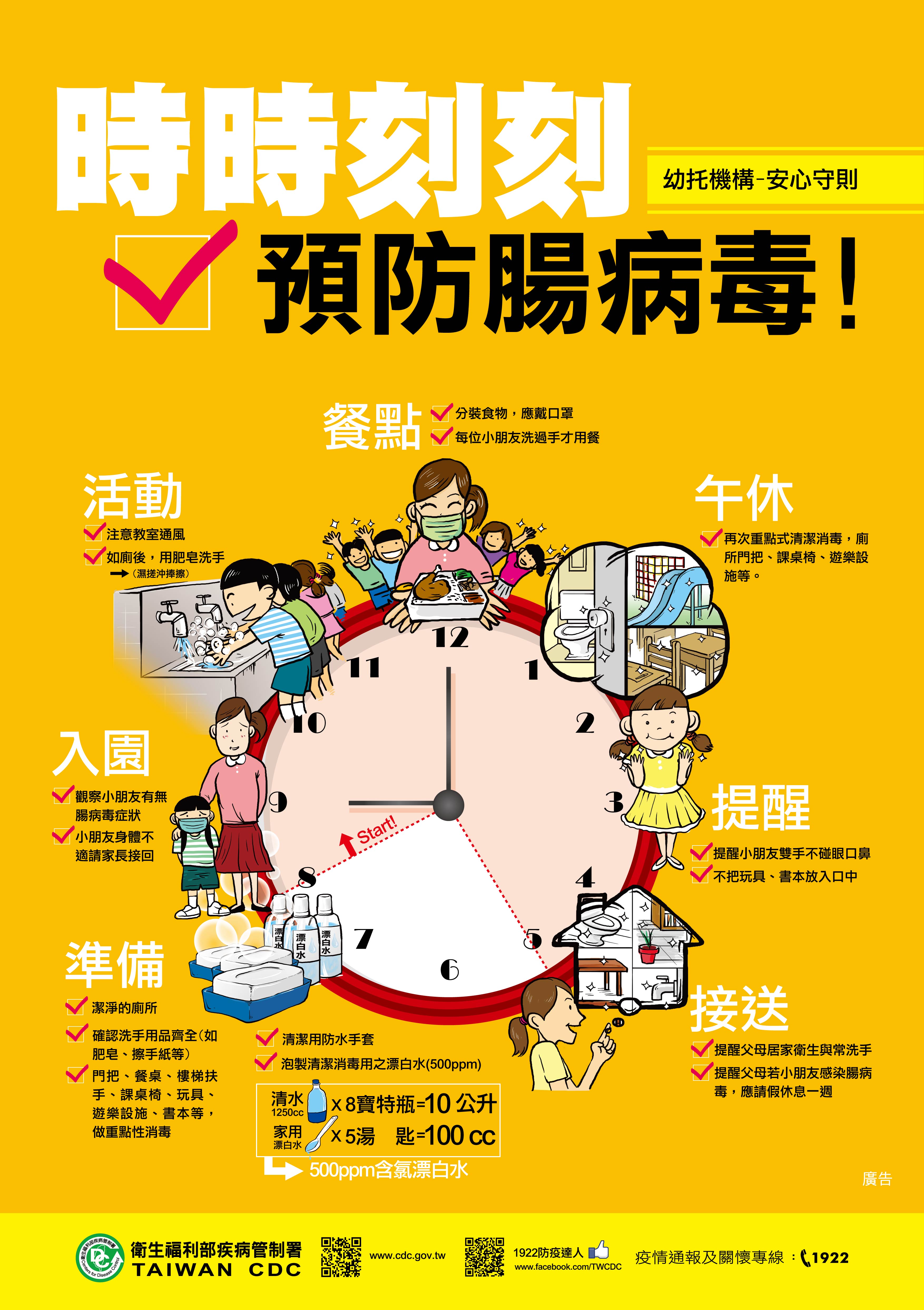 疾管署再次呼籲,5歲以下嬰幼兒是腸病毒併發重症的高危險族群,民眾如發現嬰幼兒出現嗜睡、意識不清、活力不佳、手腳無力或麻痺、肌躍型抽搐(無故驚嚇或全身肌肉突然收縮)、持續嘔吐與呼吸急促或心跳加快等重症前兆病徵,請立即送到大醫院治療。相關資訊可至疾管署全球資訊網(https://www.cdc.gov.tw),或撥打免付費防疫專線1922(或0800-001922)洽詢。