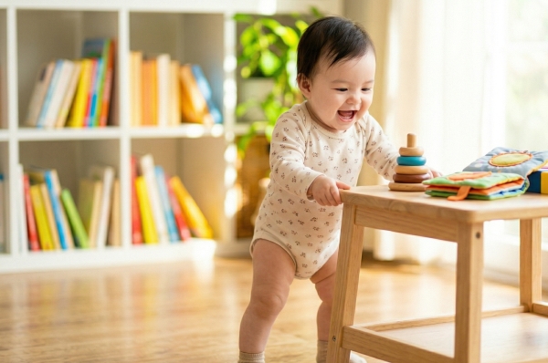 除此之外,這個年紀的寶寶已經可以扶著物品走路,會自己爬起來坐在椅子上、用大拇指和食指捏住物品、玩一些簡單的遊戲,同時也開始發展語言。基本上已經可以發出單音,說「爸爸」、「媽媽」、「bye bye」等少量單字,也能夠了解某些單字的意義、稍微聽懂爸爸媽媽講的話,特別是命令式的詞語,譬如「東西給我」、「不可以」、「不行」等等。