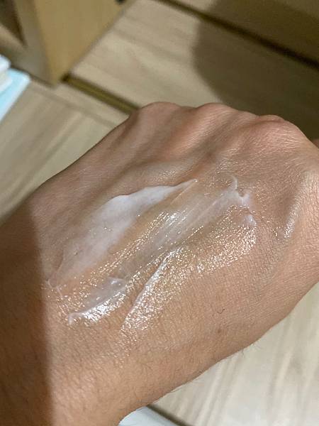 用手劃開,相當好推勻,雖然名稱是霜狀,但不會難推,也不是乳液的水狀,滋潤度很夠,覺得相當適合冬天使用呢!
