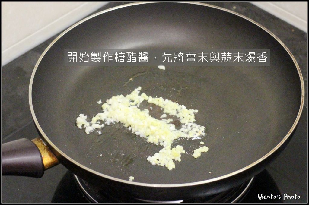 【製作糖醋醬的第一步驟:加油熱鍋,爆香薑末與蒜末】