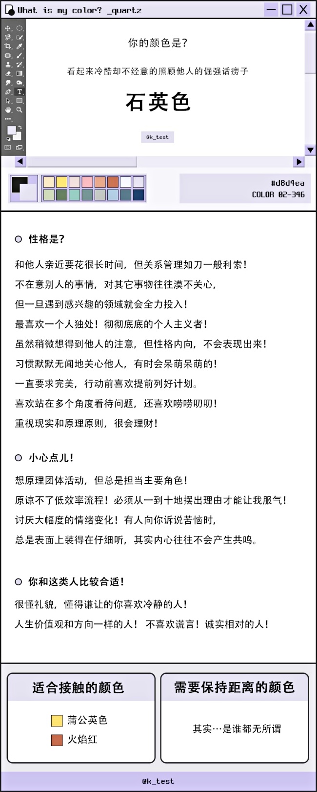 來來來,大家先別著急,讓妞編輯解釋完就讓你們開測!最後結果會出現專屬於你的色票,從性格、需要注意的部分以及適合結交的類型都一一詳細分析出來,最後更貼心列出「適合接觸的色票」以及「最好遠離的色票」(笑),只要透過這個網址(點我),能夠自動轉換成漢字版本開始測驗,不會韓文也沒關係!(快揪朋友們一起玩)