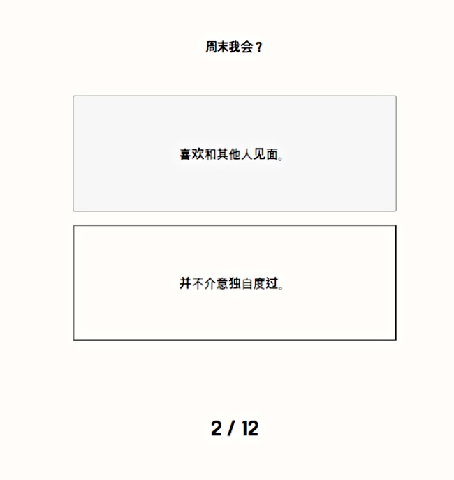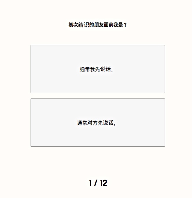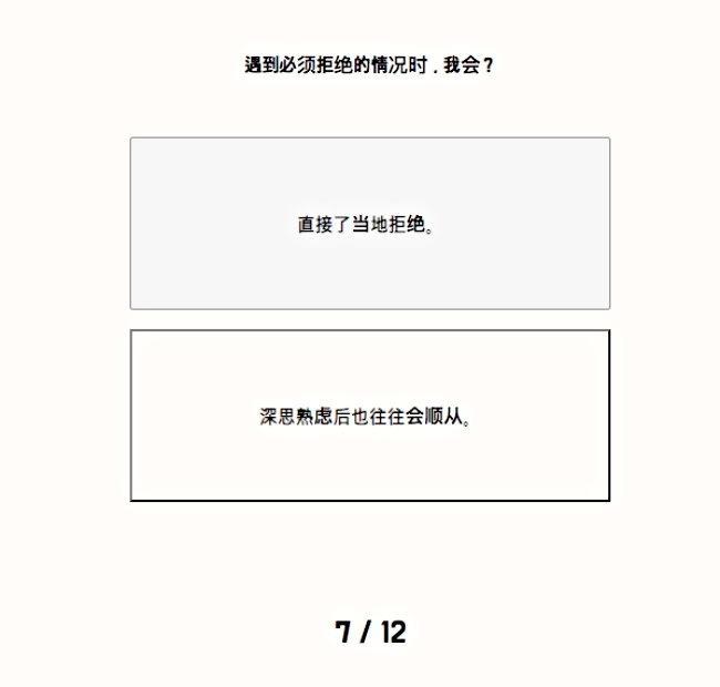 首先依照自己的第一直覺,針對問題2選1按下真實答案,例如:「面對第一次見面的人我會?1.我先搭話2.等著對方跟我說話」、「遇到必須拒絕的情況時的我?1.強硬表示拒絕2.就算思考很久最後也會選擇順從」等等一共會出現12個提問…