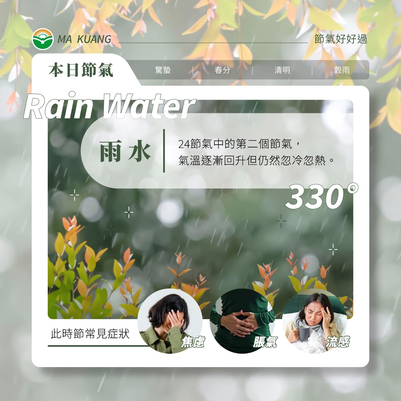 雨水是二十四節氣中的第2個節氣,雨水節氣過後,氣溫逐漸回升但溫度仍然忽冷忽熱,同時濕氣開始加重,因此養生重點為「祛濕、健脾、顧復陽氣」。