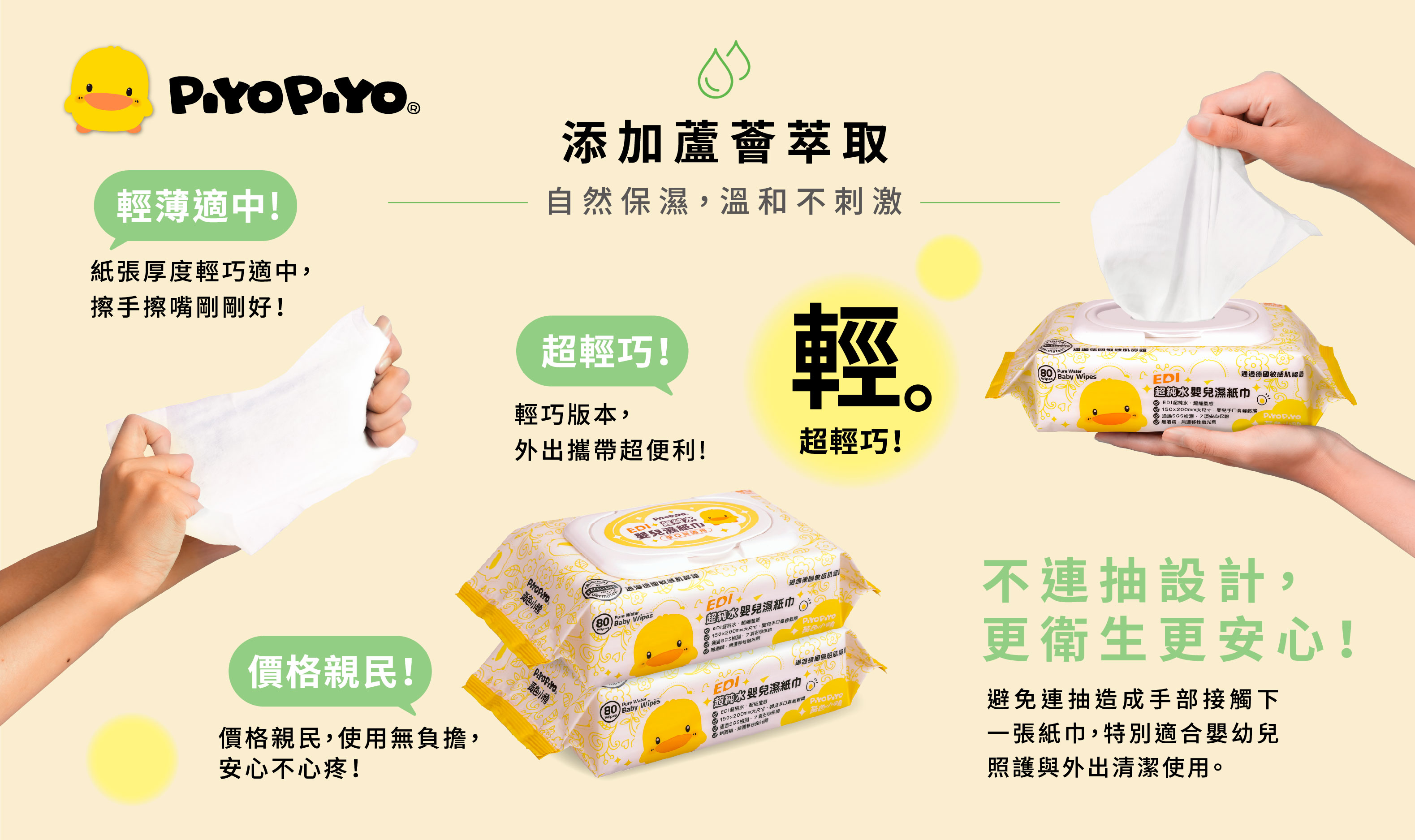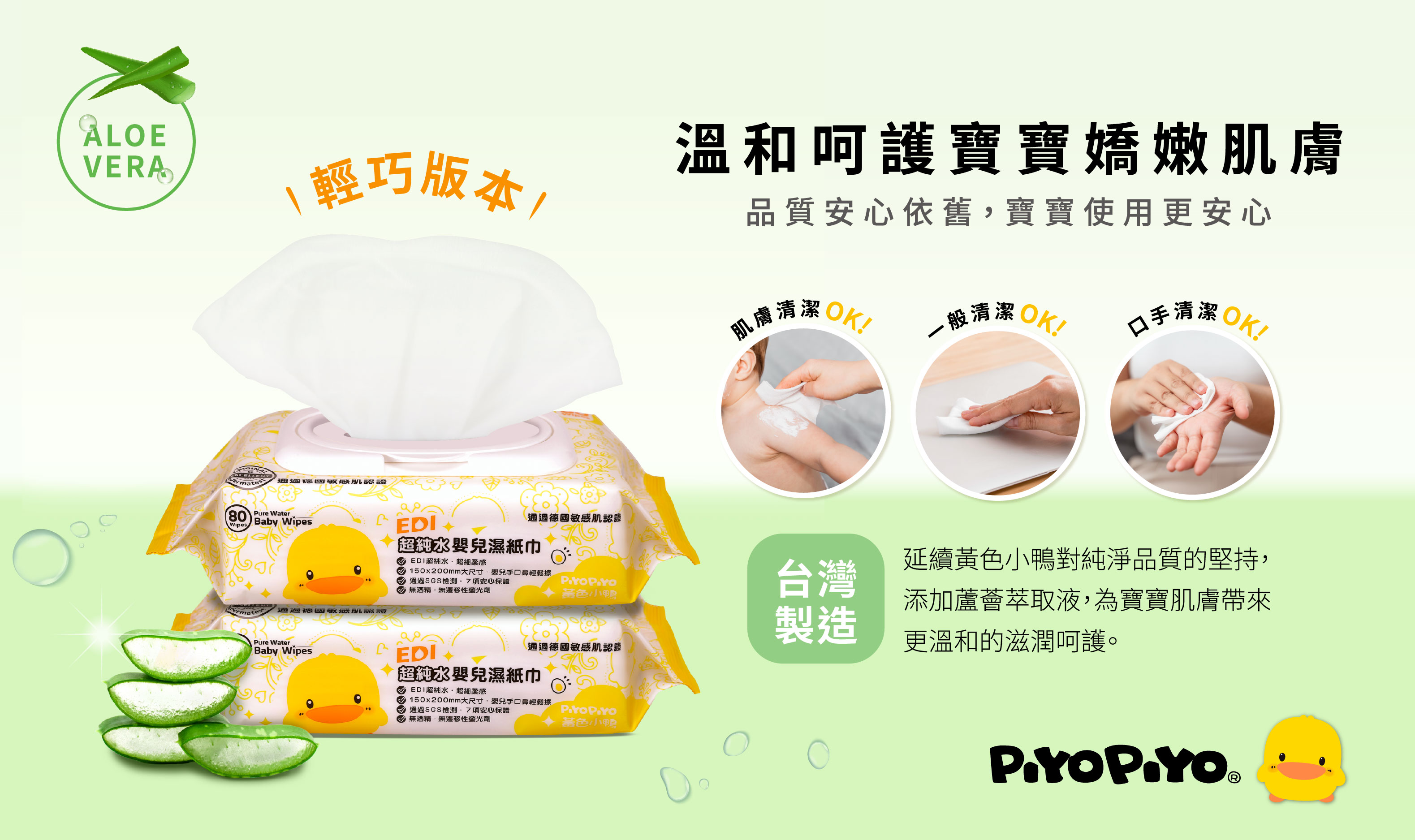 以台灣母嬰品牌-黃色小鴨推出的 超純水搭配蘆薈保濕配方的嬰兒濕紙巾 為例,主打無酒精、無香精設計,並在紙張觸感與保濕度之間取得平衡,正是針對高頻使用情境所設計。