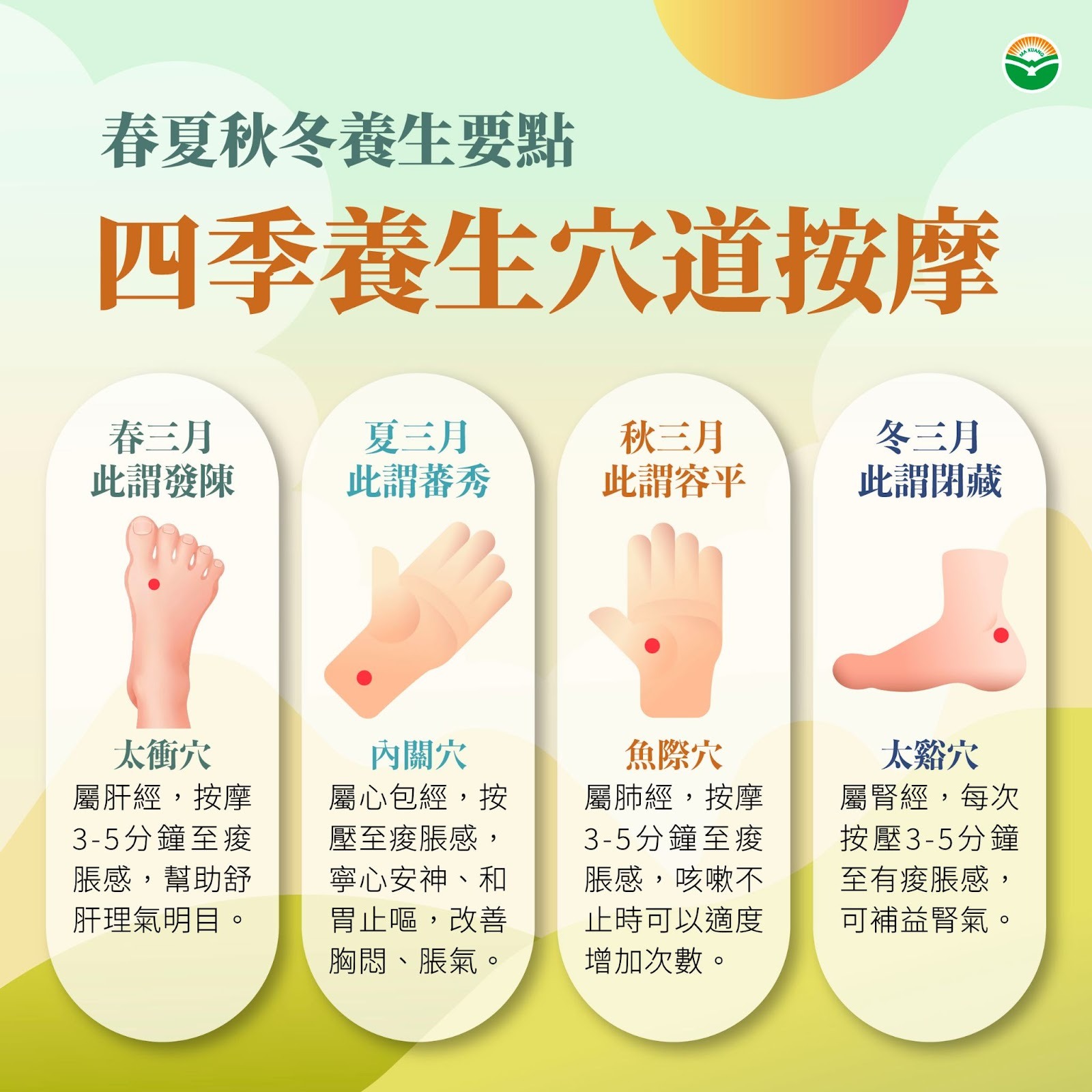四季有節、養生有道,現代人生活忙碌緊湊,往往缺少時間細心照顧自己,不妨從簡單的日常飲食與穴位保健著手,一點一滴調養身體,一同面對各種挑戰。