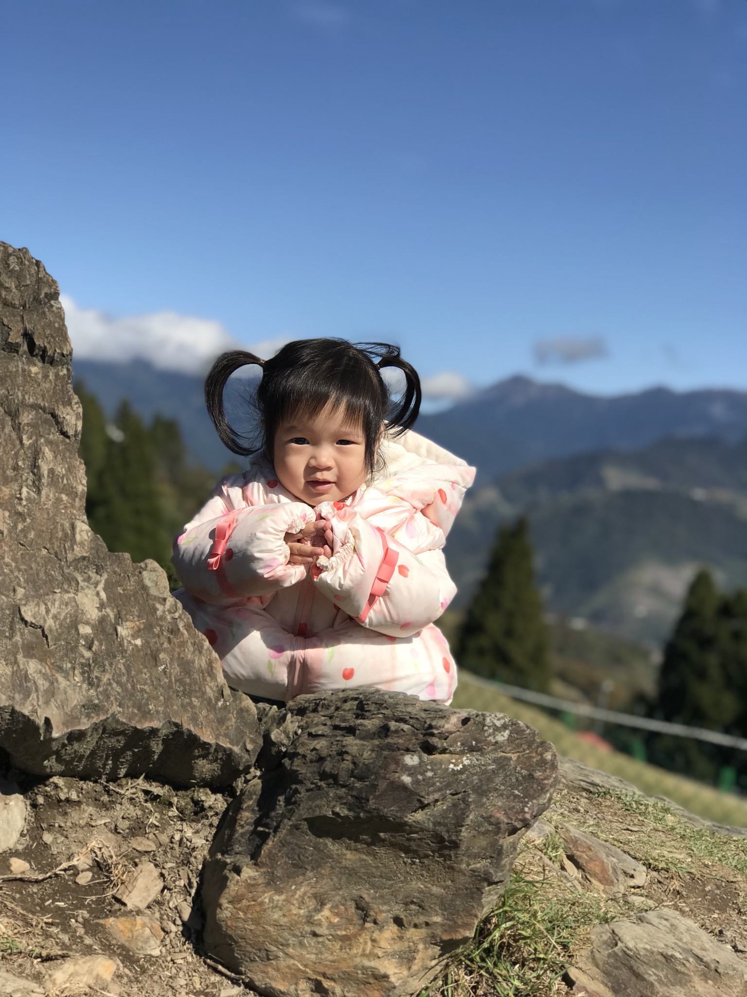 穿著粉橘色的小女孩,在藍天白雲奇萊山脈的襯托下,像花朵般綻放