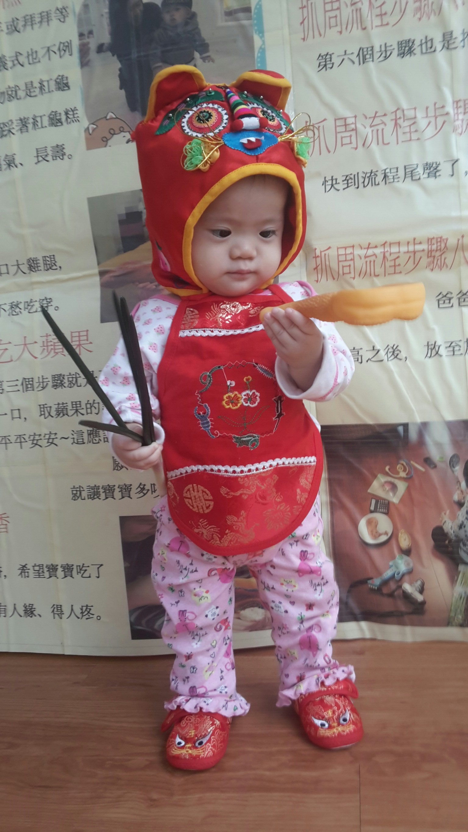 你在看我嗎?可以靠近一點哦!我是愛笑並帶給大家歡樂的湘湘~猜猜我抓周抓到什麼?